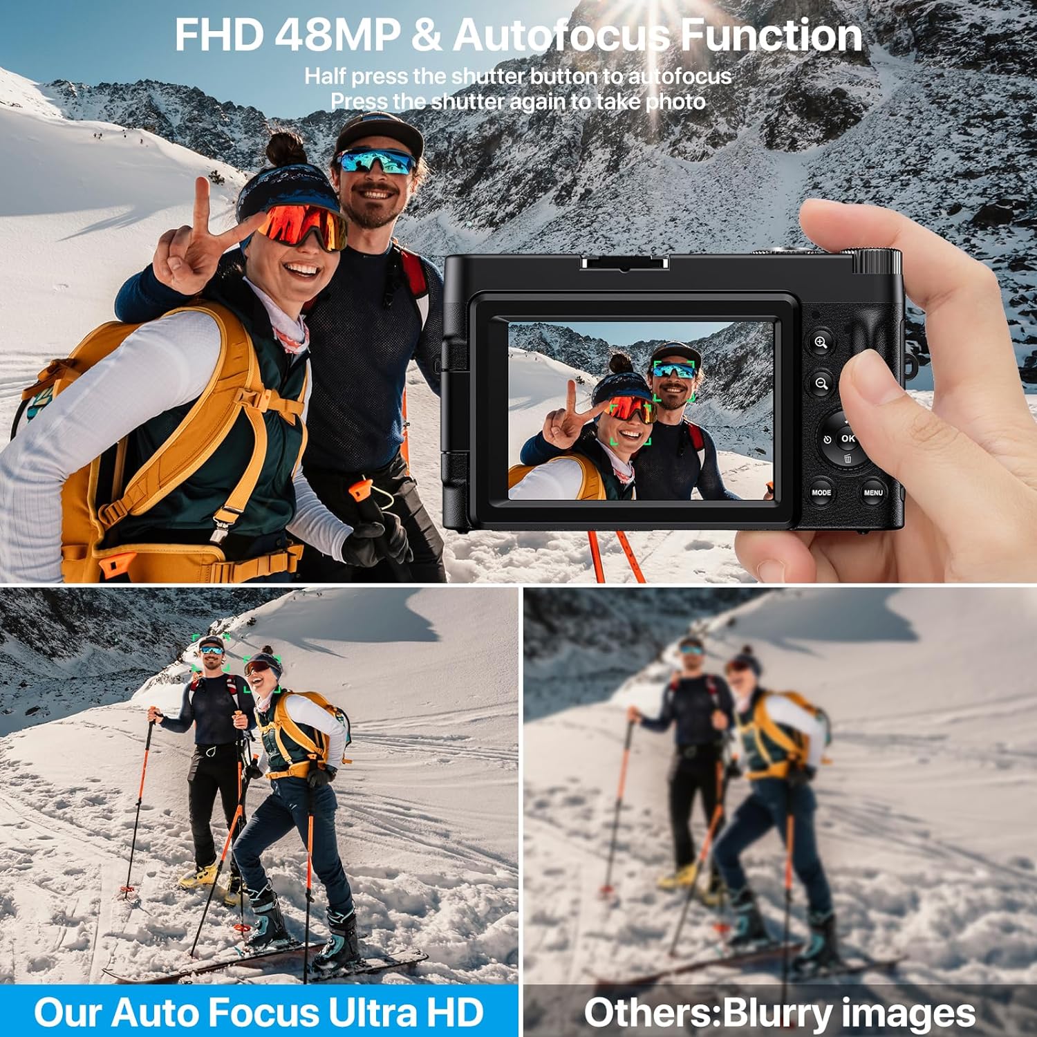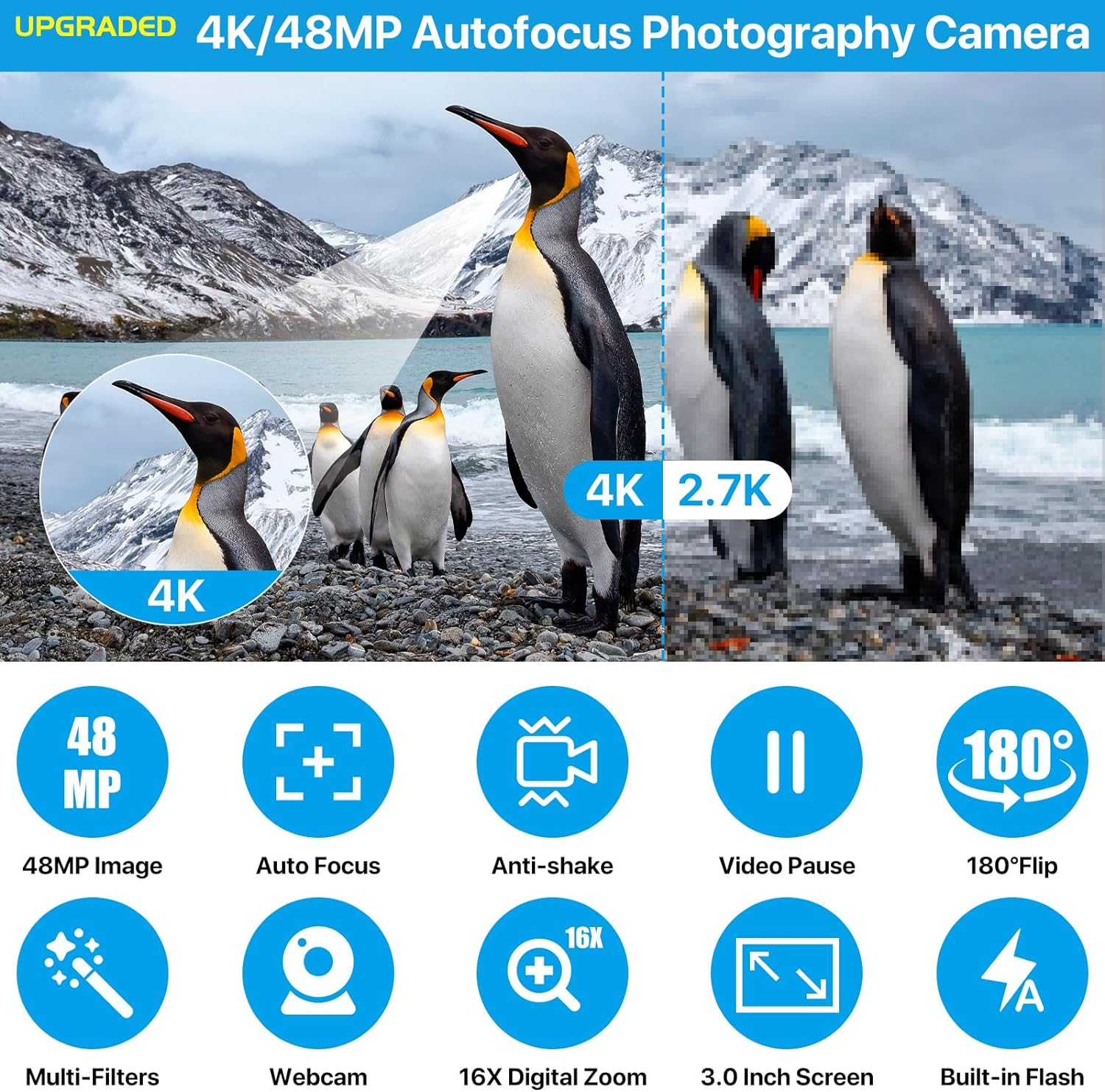 4K Digital Camera for Photography Autofocus 48MP 4K Camera with SD Card, 180° 3.0 inch Flip Screen Vlogging Camera for YouTube Video Compact Cameras with 16X Digital Zoom, Anti-Shake, 2 BatteriesCreate a new description for this product from the title with 500 characters