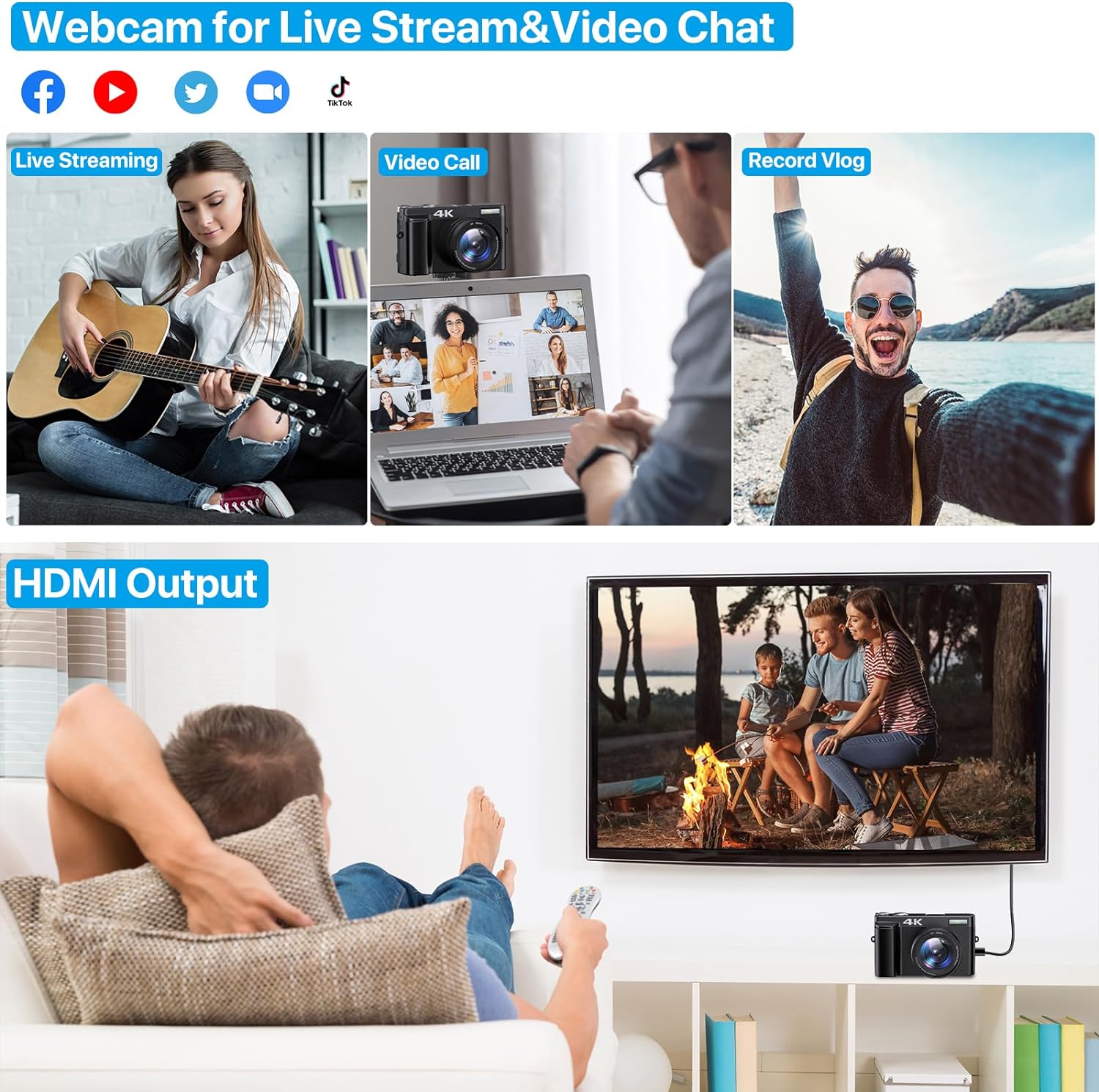 【Webcam for Live Streaming & HDMI output】: This 4K digital camera can be used as a webcam, please plug in the USB cable and switch the camera to “webcam” mode, perfect for live streaming, blogging, vlogging, online teaching and more. You can also connect a TV or projector/camcorder via an HDMI cable. Not only supports an external microphone with a 3.5mm jack for clear recording, but also supports an external 1/4 standard size tripod. The equipped hot shoe can also connect an external fill light.