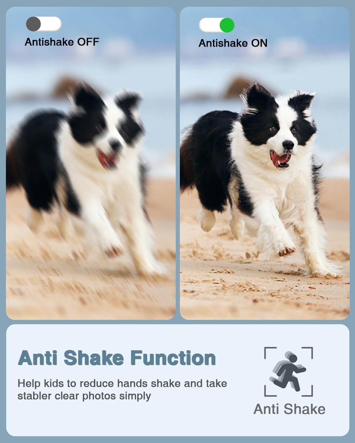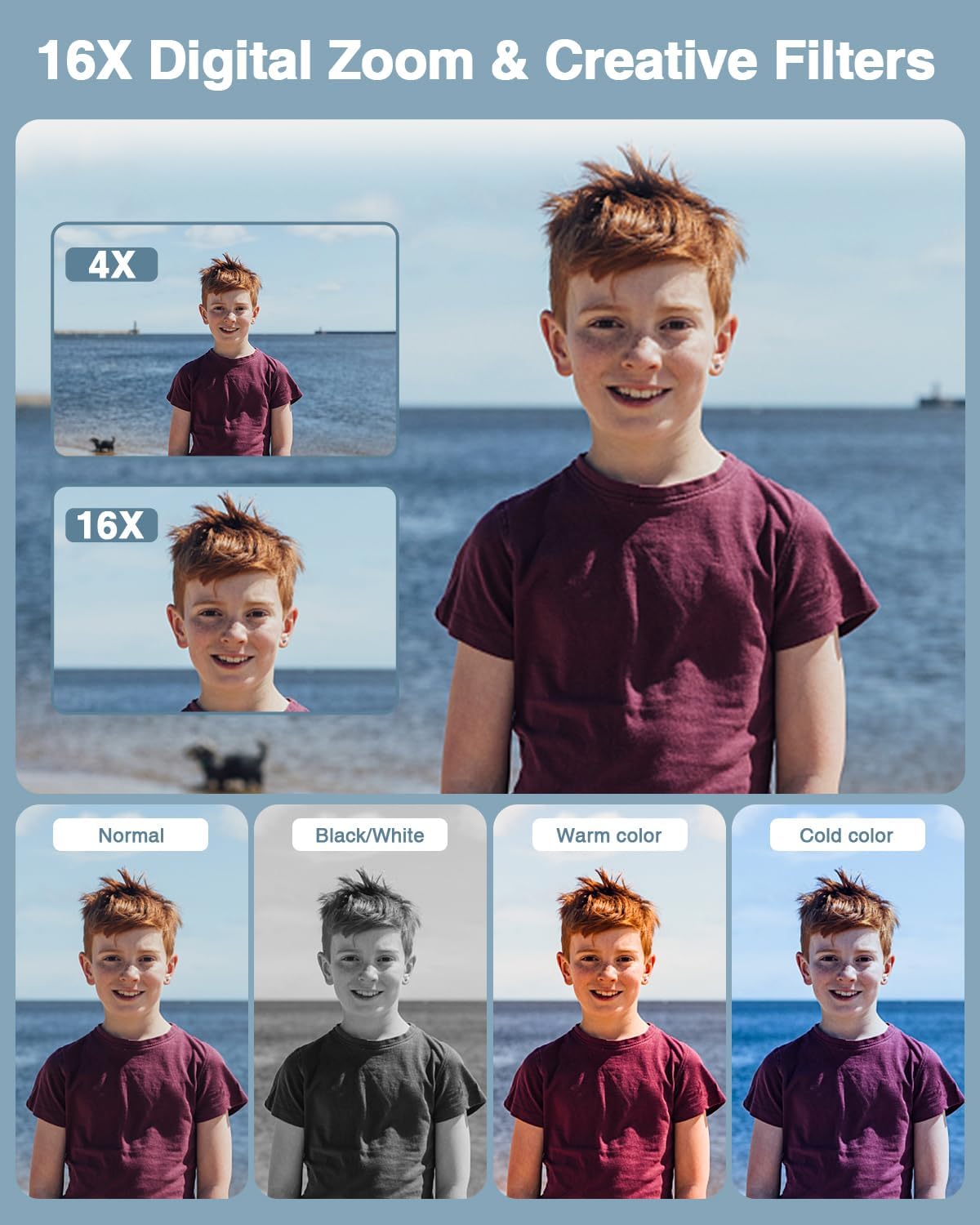 â€ăSafe Materials & Creative FiltersăMade of high-grade and eco-friendly reliable materials, the kid camera is safe and non-toxic, durable and withstands drops. This digital vlogging camera for teens also supports six cute filter effects to choose from, kids could create more adorable colorful pictures.