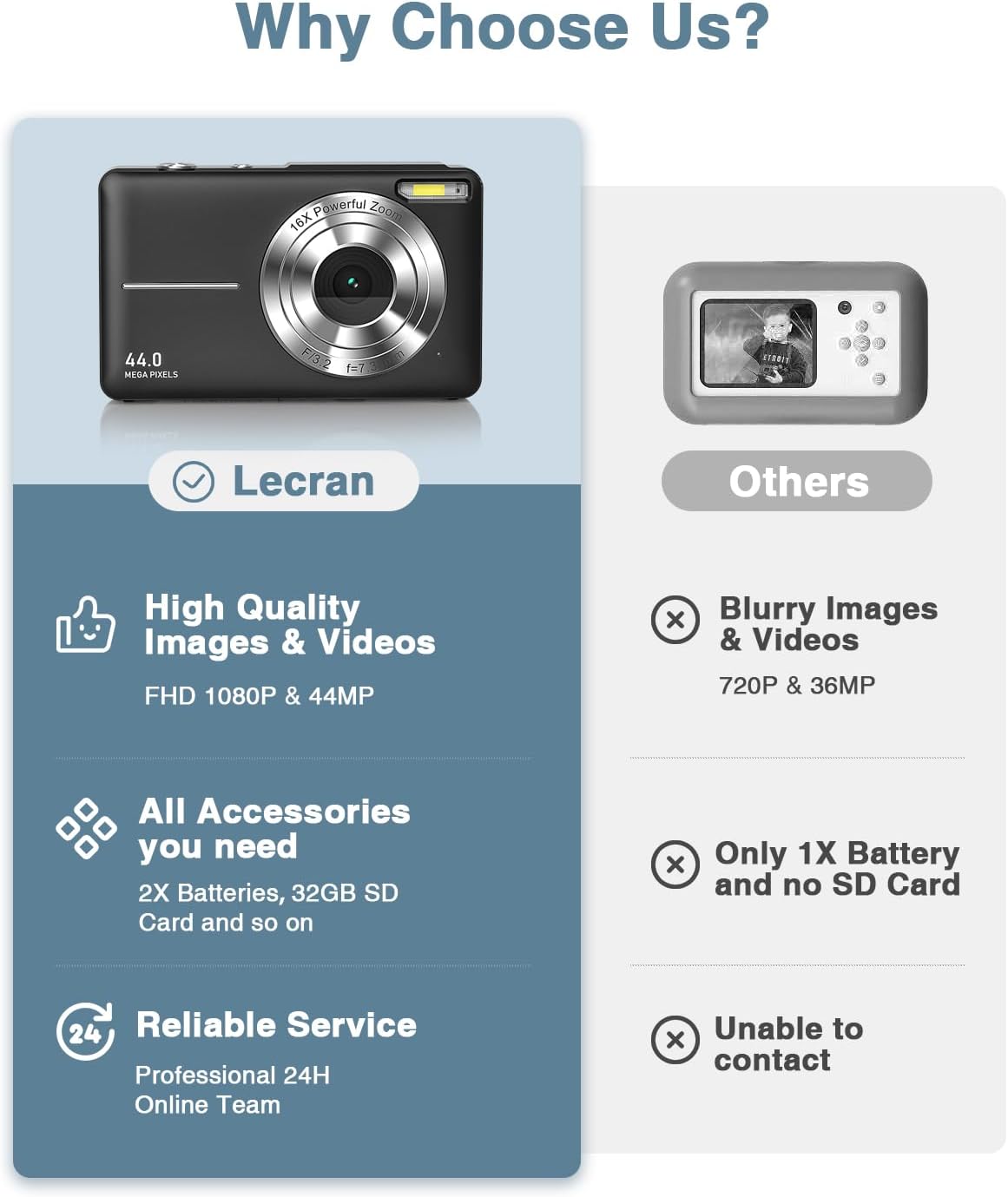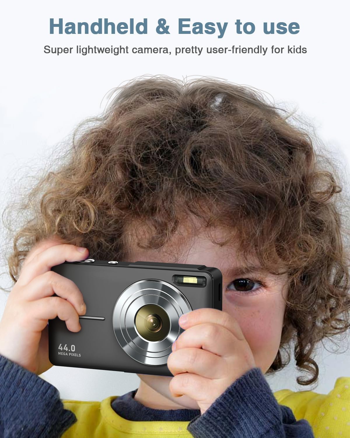 Lecran Digital Camera, FHD 1080P Kids Camera with 32GB Card, 2 Batteries, Lanyard, 16X Zoom Anti Shake, 44MP Compact Portable Small Point Shoot Camera for Kids Student Children Teens Girl Boy(Black)Create a new description for this product from the title with 500 characters