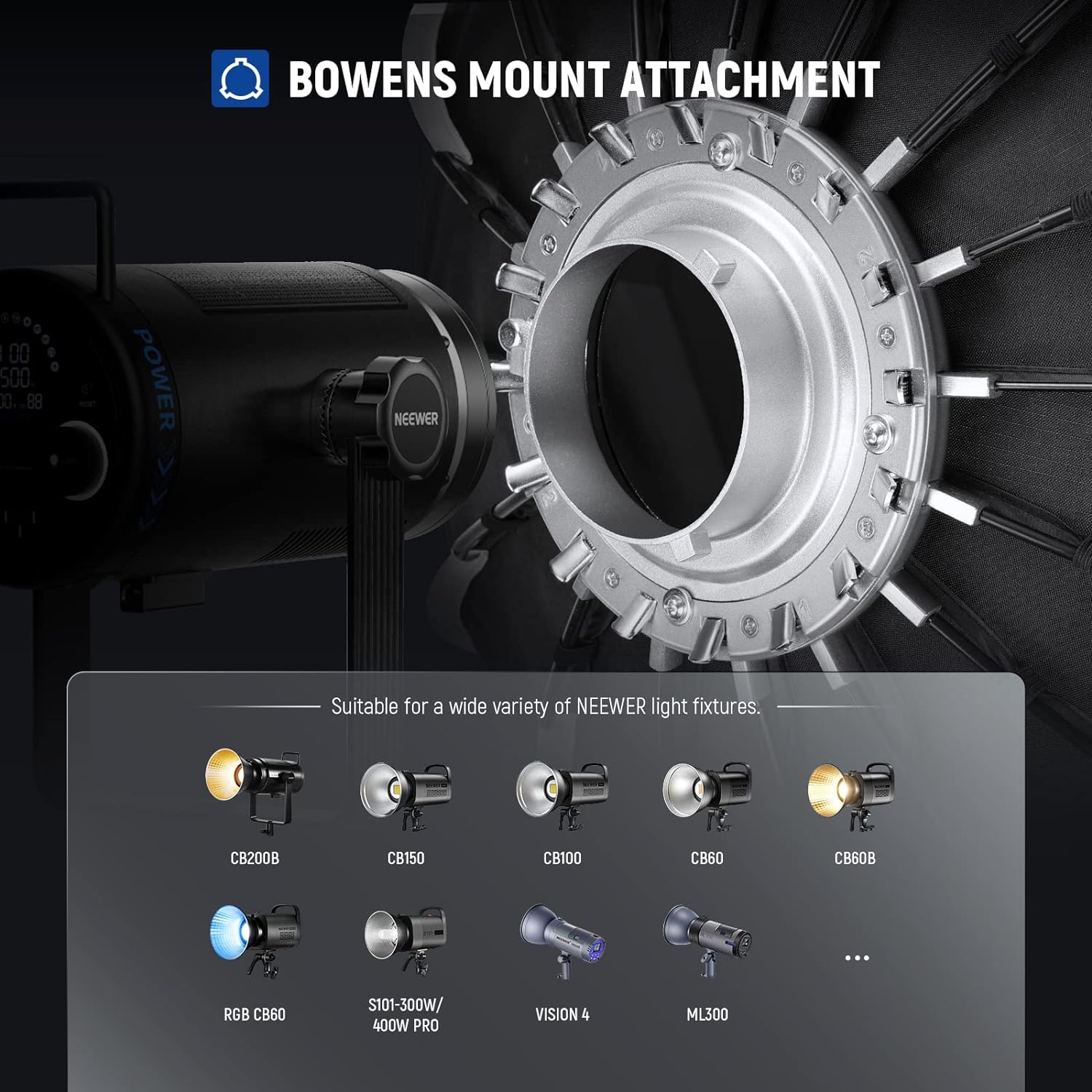 【More From NEEWER】 Use this softbox with NEEWER Q4 Studio Flash Vision 4 Monolight and CB60B CB60 RGB CB100 C CB150 CB200B CB300B FS150 FS150B FS230 COB Studio Light (Also compatible with SmallRig compatible with Godox compatible with Aputure Continuous Video Light with Bowens Mount). We recommend ST250R ST-260AC Photography Light Stand & SC320 NEEWER C Stand with Boom Arm to provide exceptional strength for heavy duty use