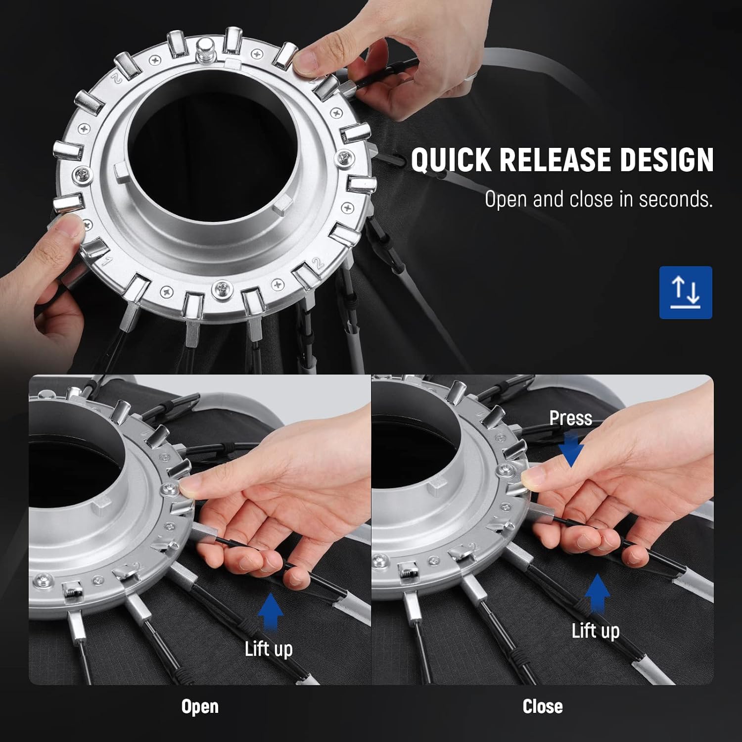 【Quick Release & Quick Fold Structure】 16 highly resilient ribs give this softbox incomparable durability and an impeccable parabolic shape that can withstand tens of thousands of presses without deformation for years of use. The quick release design allows you to set the softbox up in less than 15 seconds without any tool. Foldable and merely 5.7lb (2.58kg) in weight, the softbox is easy to store and transport inside the included carrying bag