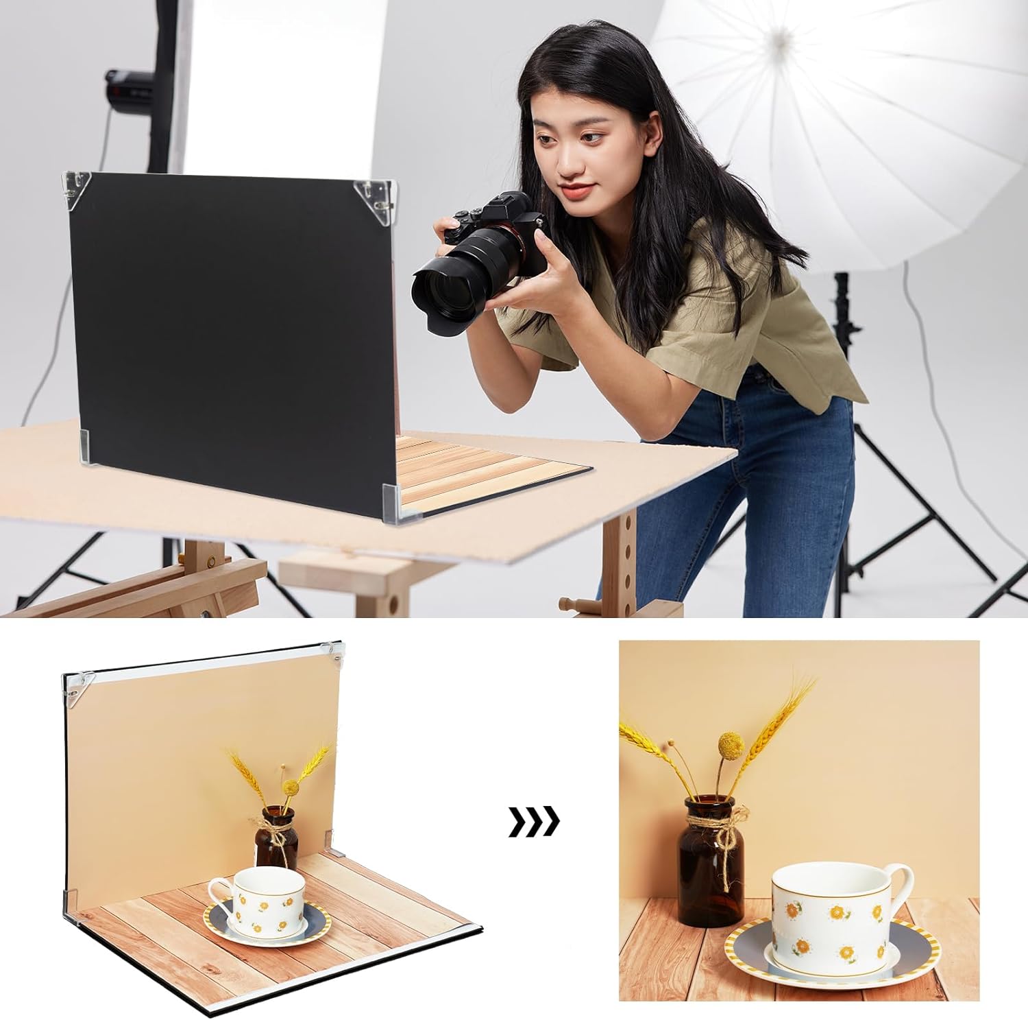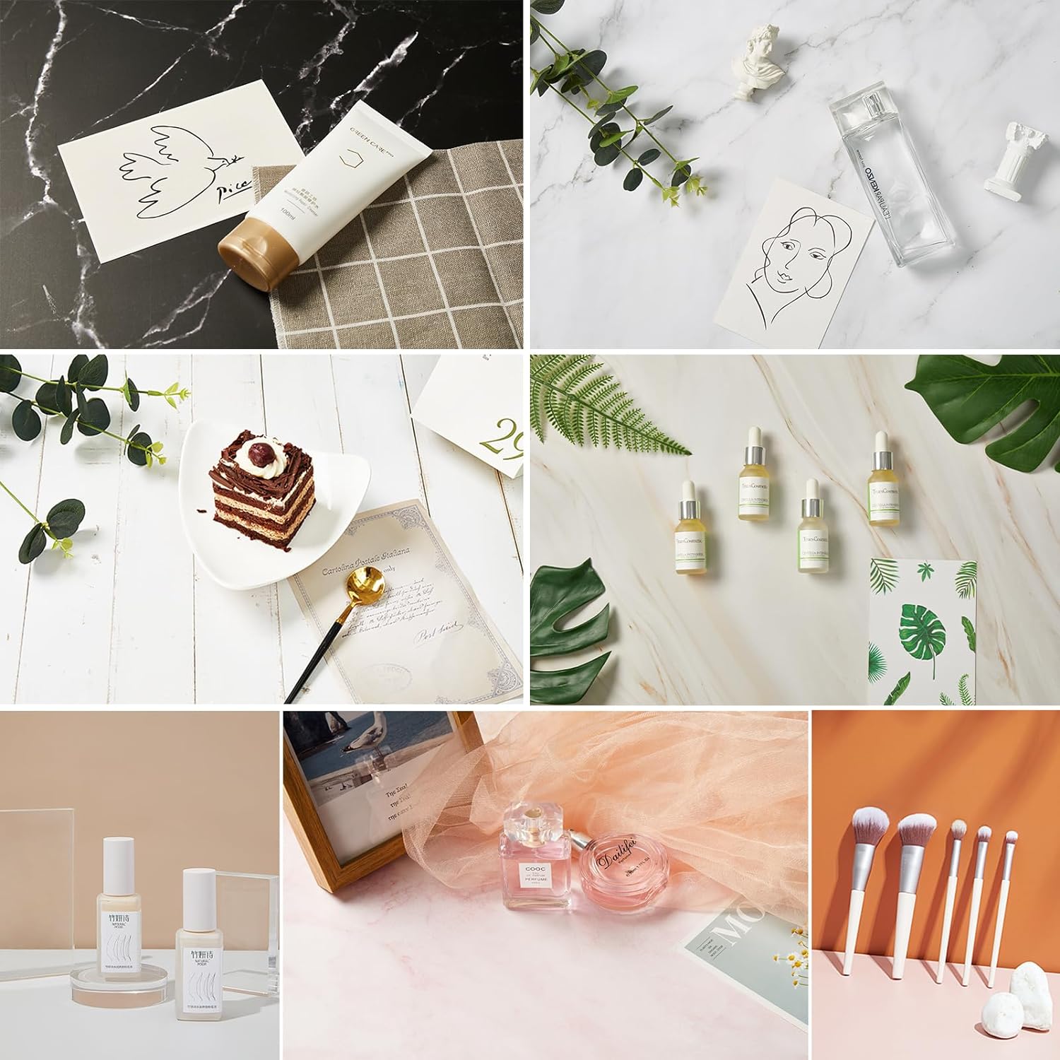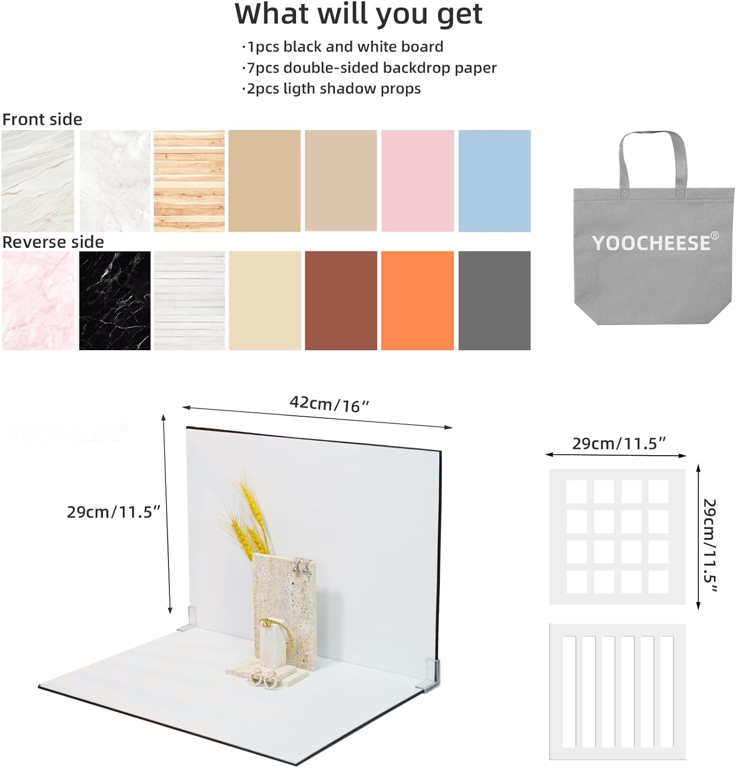 Small Backdrop Board Kits: Black and white backdrop boardMake Product Picture More PRO: Using Yoocheese backdrops board for photography will make your pictures more professional and eye-catching including food, jewelry, cosmetics, and other small object and other small object.Photo Board and Photography Backdrops Material: The white and black board make of 2.5mm thicken photography paper card. The backdrops made of 0.66 pounds high quality coated photography paper,3D printing pattern, double-sided colored. Durable and waterproof on surface which is easy to clean with a wet towel.Table Top Photography Partner: The background board with different backdrops which is easy to shoot attractive pictures, suitable for small product photography .Friendly for still lift photographer, bloggers, on Instagram, online seller.