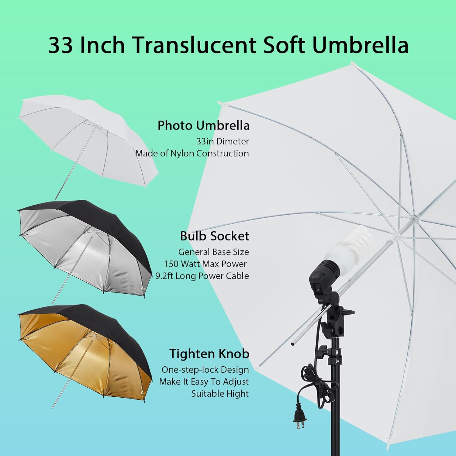 The umbrella can soften, broaden and diffuse the light output of any tungsten or studio flash source. Bulb holders with 180° rotatable head which can adjust the angle according your needs. Manually adjust distance between light bulbs & umbrella to get best light.