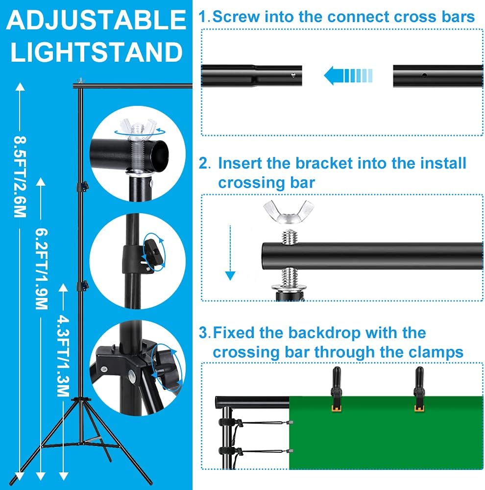 【THE PHOTOGRAPHY KIT INCLUDES】(1)2.6x3M/8.5x10ft Backdrop Support Stand+ (4)8.5ft/2.6M Light Stand+ (2)Softbox+ (2)33″ Translucent Umbrella+ (2)E27 Bulbs Holders+ (2)45W Energy Saving Bulbs+ (2)85W LED Bulbs+ (6)Backdrop Clamps+ (6)Backdrop Clip Holder+ (3)1.8×2.8M/71×110″ Backdrops (Black/White/Green)+ (2)Remote Control+ (2)Sandbags+ (1)24″ 5-In-1 Reflector+ (1)Carry bag.