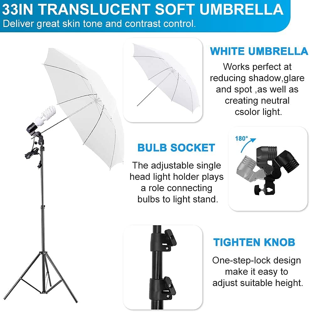 【2x UMBRELLA WITH 45W BULBS】The 33″ white translucent umbrella can soften, broaden and diffuse the light output of any tungsten or studio flash source. The 2 45W day-light studio light bulbs: equals 200W regular incandescent light bulb output. 5500K fluorescent spiral bulb generates a close match to natural daylight and a crisper view of the items being illuminated. It is best for photography lighting.